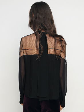 The Black Lacey shirt is defined by its delicate floral lace front, complemented by a classic collar, button cuffs, and a front button placket, offering a refined and feminine silhouette.