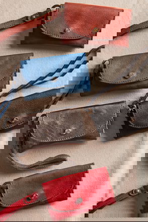 The Vienna phone holder is crafted from luxe-grained leather with a thin, adjustable carry strap. Its open-top construction is fitted with a magnetic snap fastening that’s complete with our signature door knocker hardware.