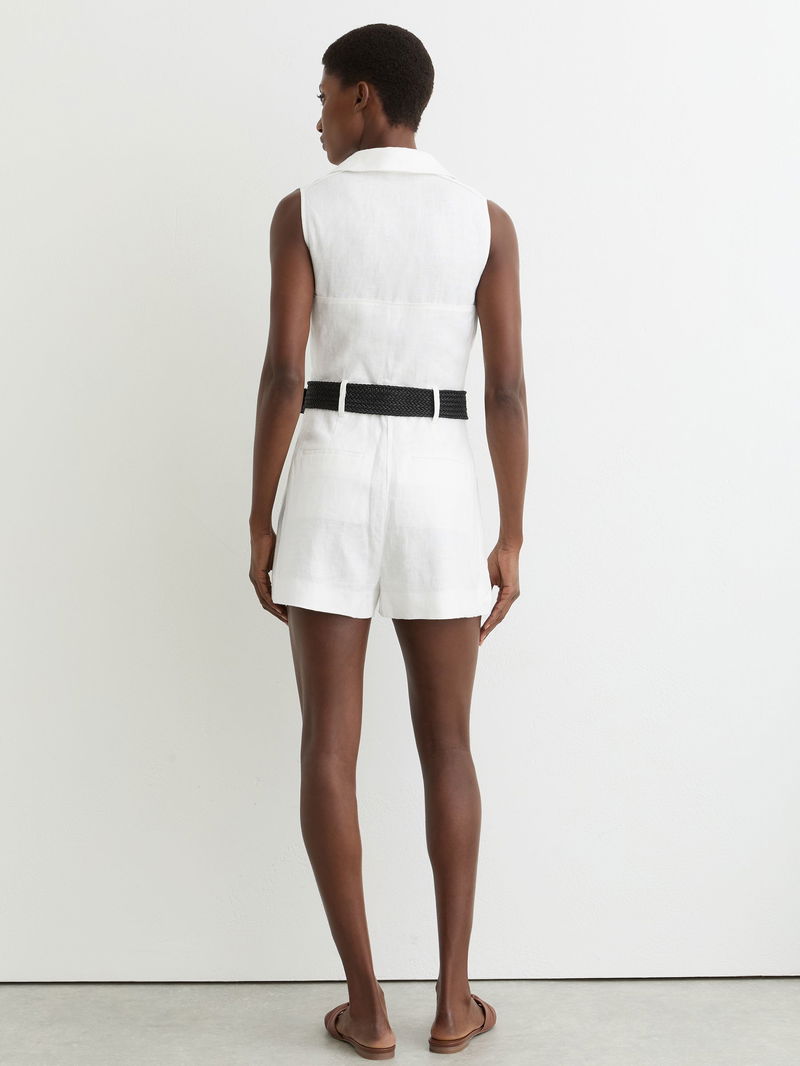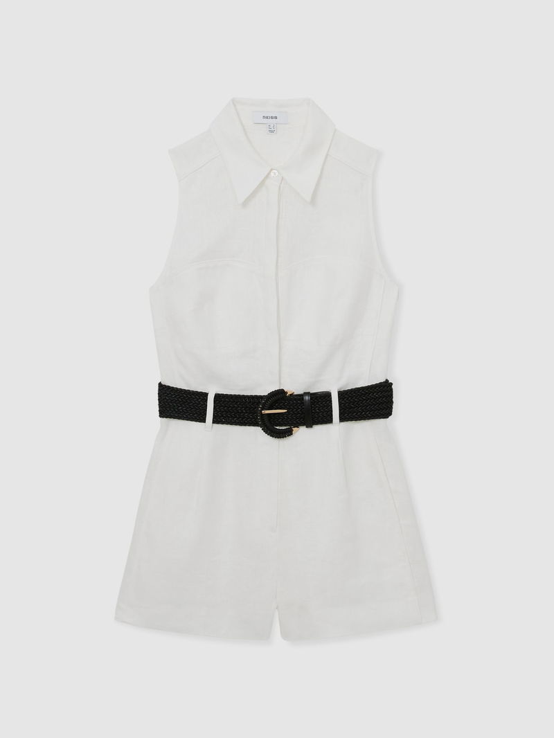Linen Sleeveless Belted Playsuit In Ivory