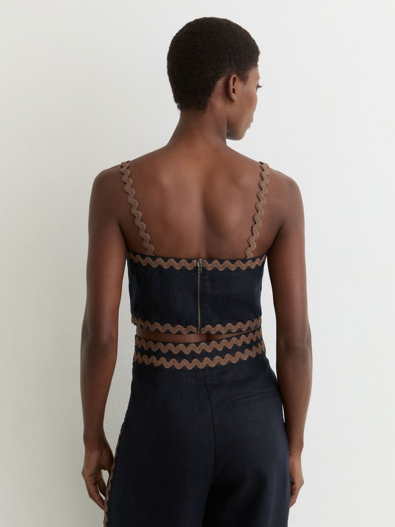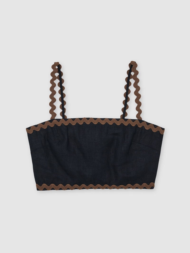 Linen Wave-Trim Cropped Cami Top In Navy/Brown