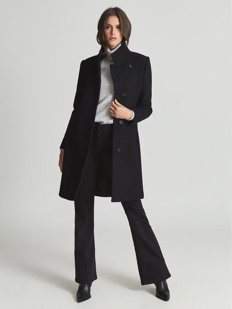 Modern and timeless, tailored to a structured shoulder with a feminine drape, the Marcie coat is a Reiss signature. It falls to an easy-to-wear slim-fitting, mid-length silhouette with a concealed buttoned front and slanted side pockets. The black shade reinforces this coat's timelessness, ensuring it will last for seasons to come.