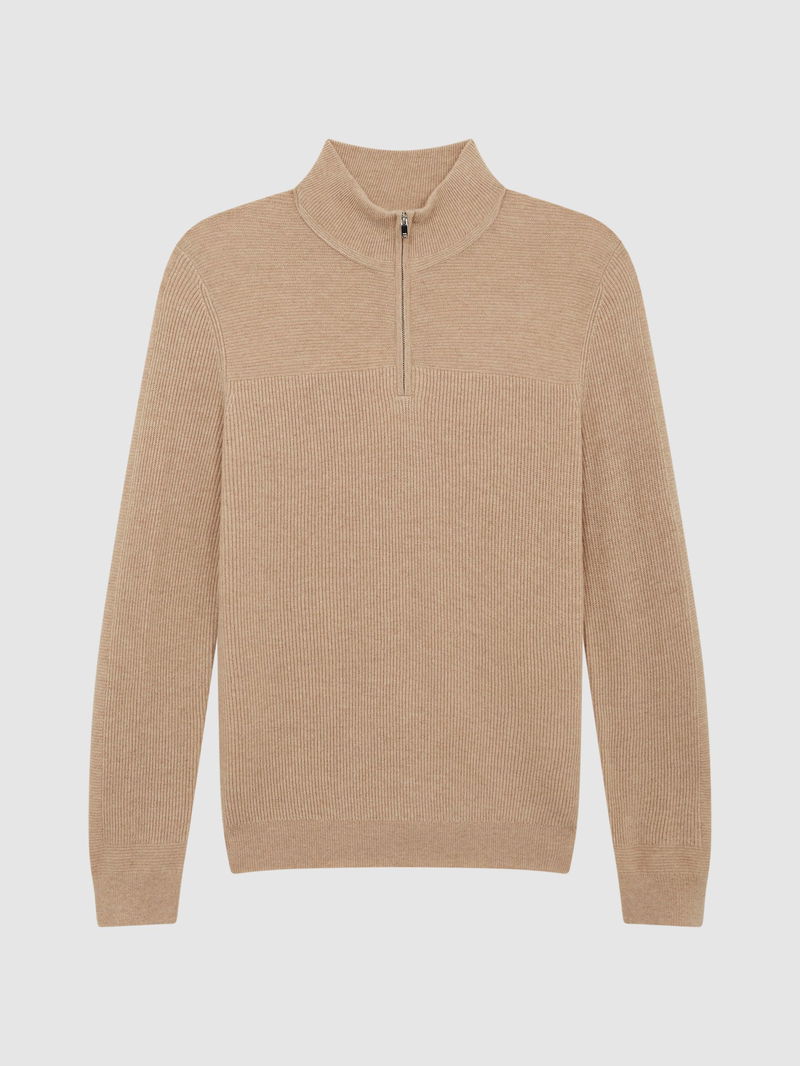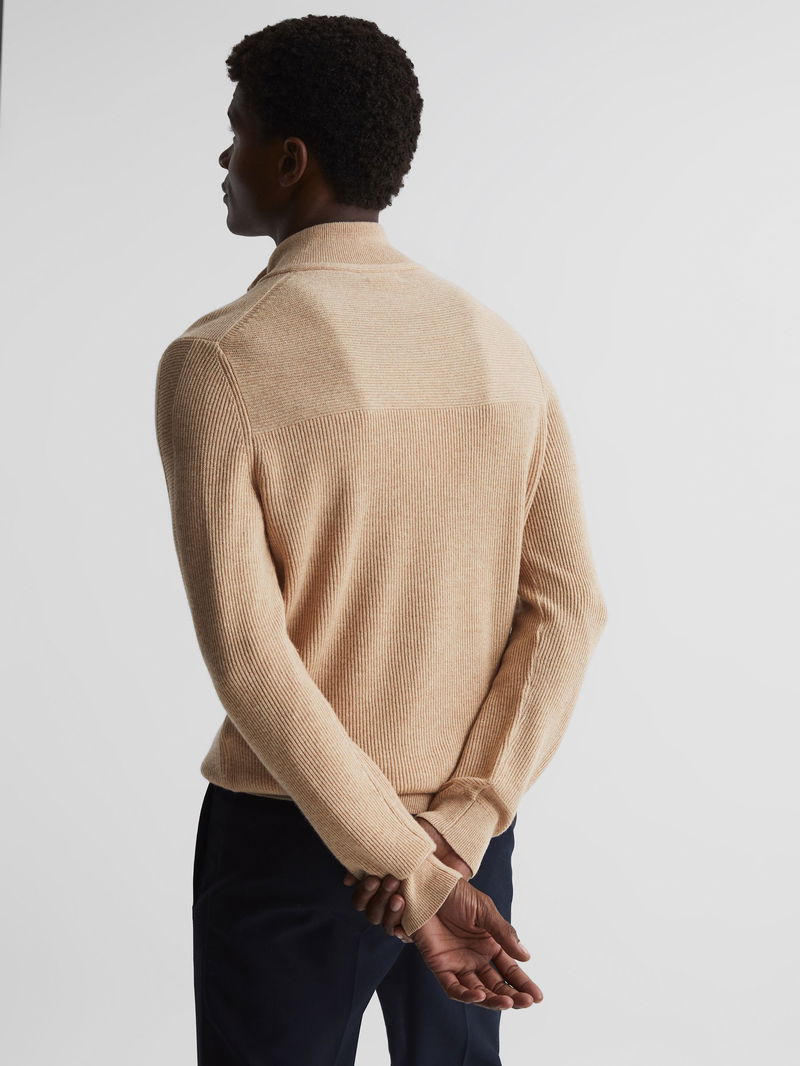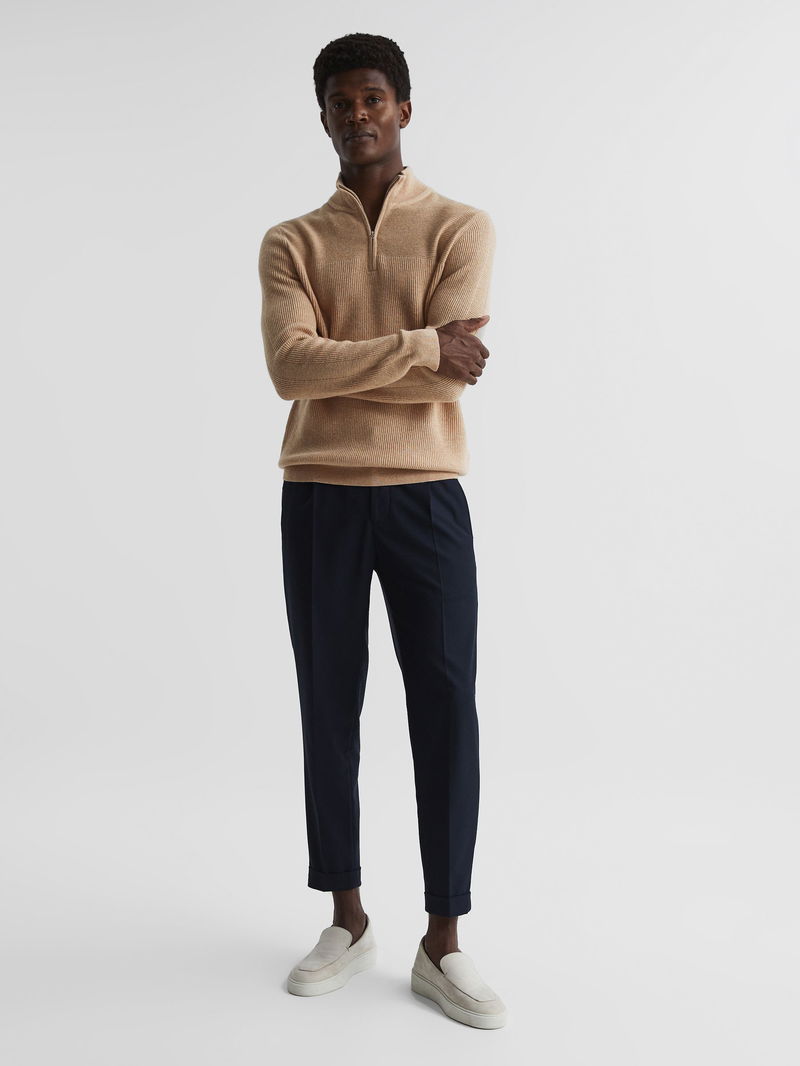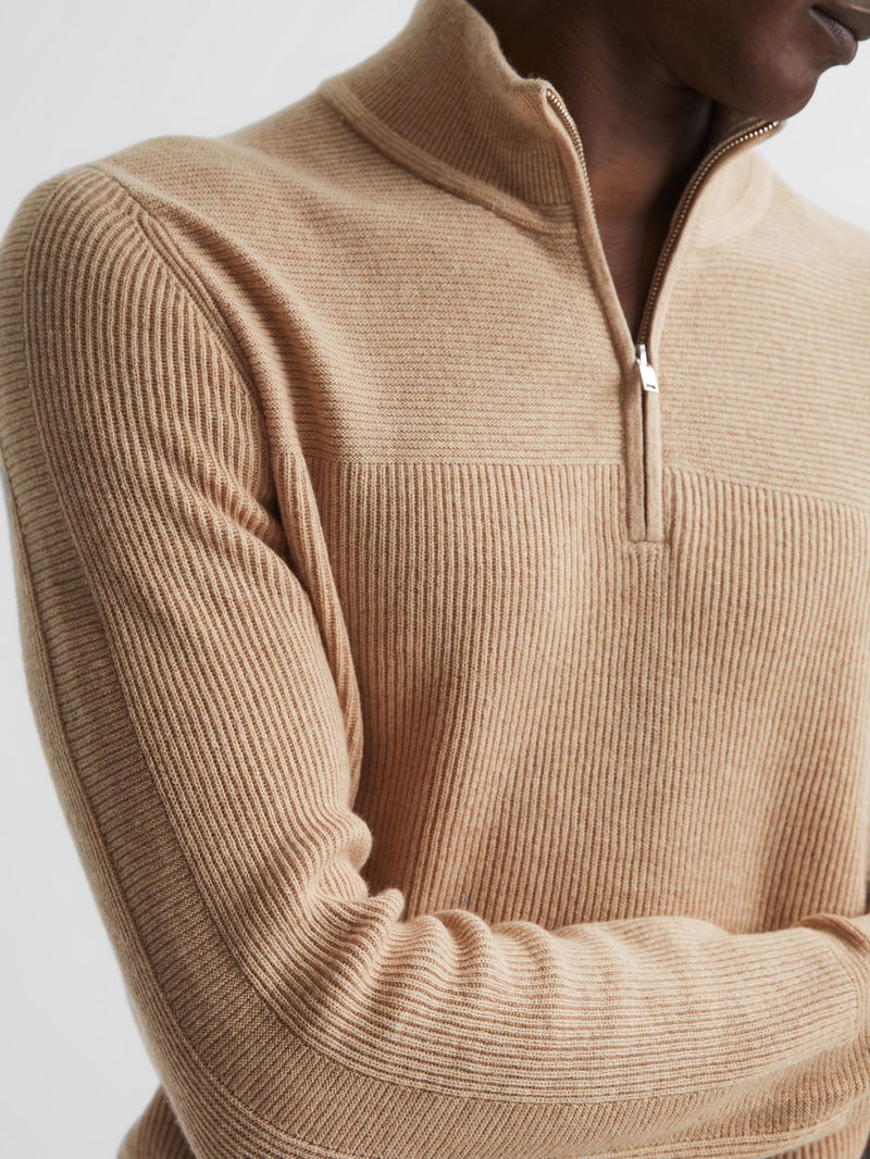 The Flip jumper in camel is crafted in Reiss’s signature half-zip style and arranged in tactile ribs. It's knitted from an enduring wool-cashmere blend for a soft hand-feel and staying power in the wardrobe. Wear it with our casual trousers and add a jacket to channel sleek winter layering.