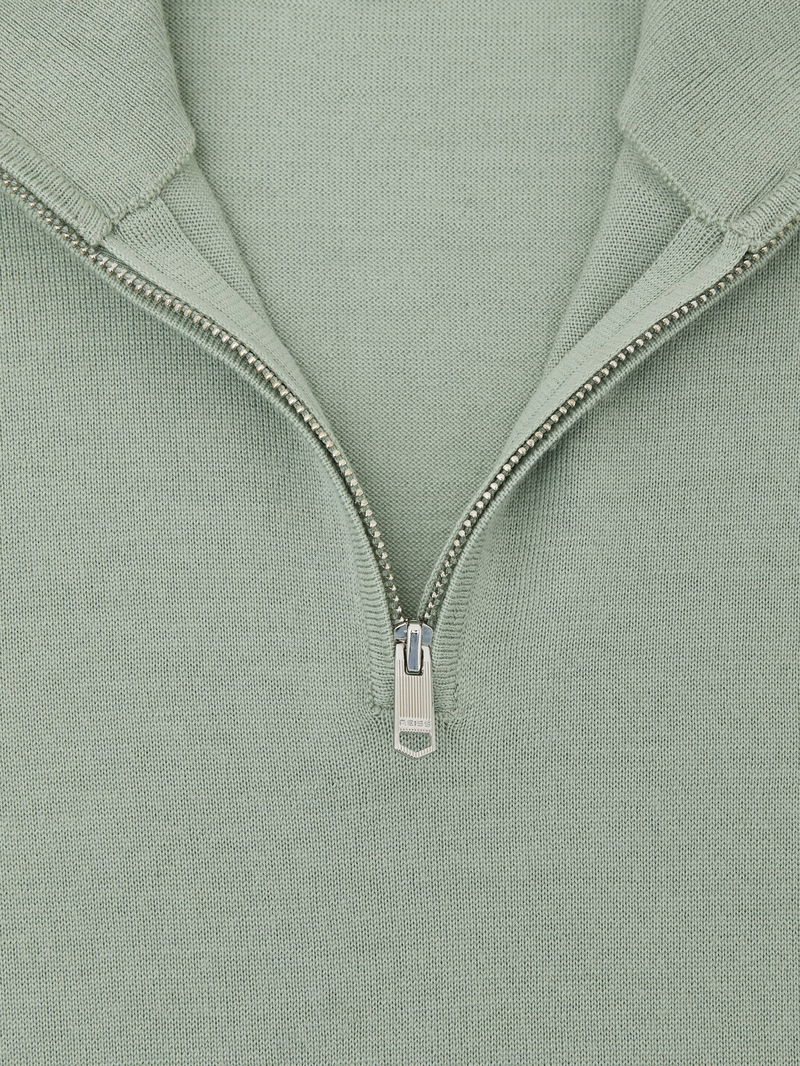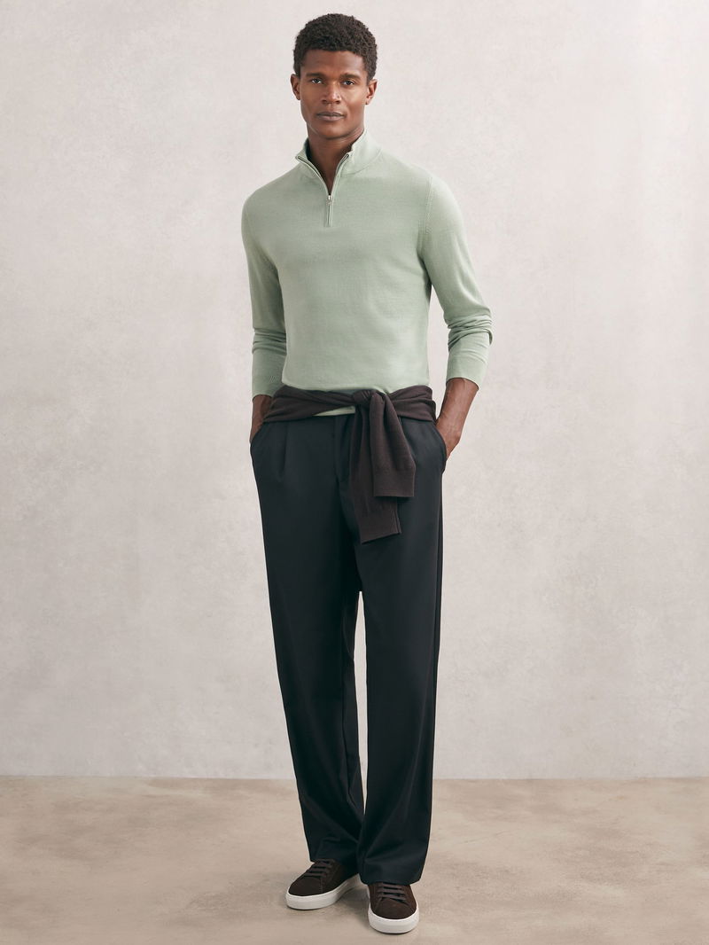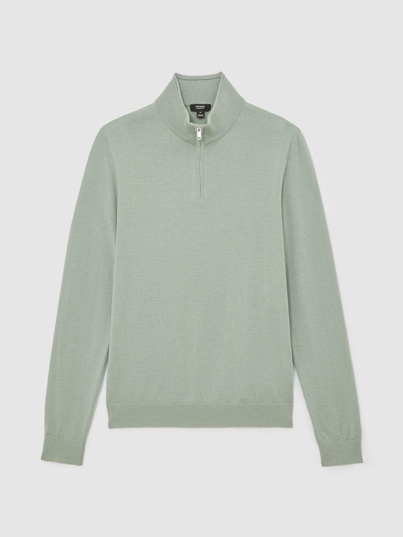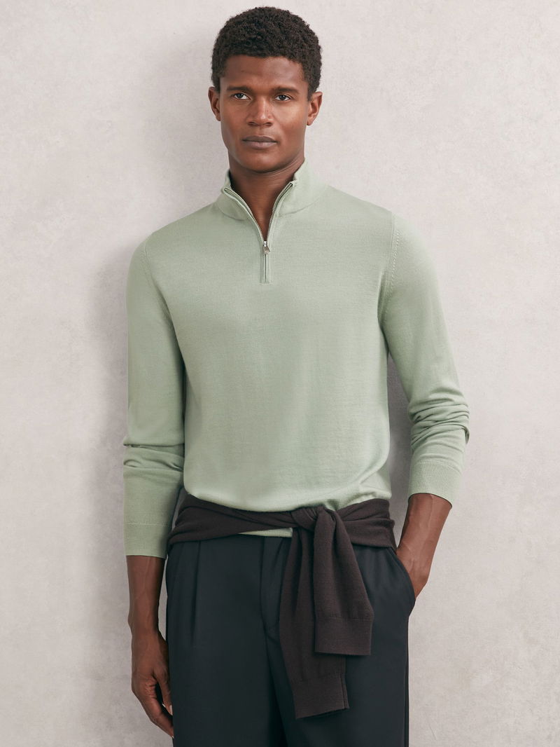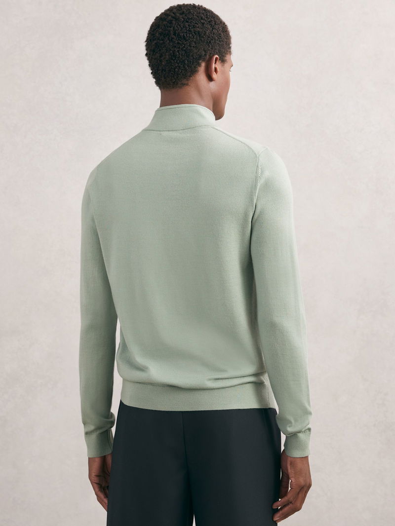 Merino Wool Half-Zip Funnel Neck Jumper In Light Sage Green