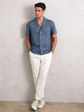 Engineered from a cool cotton blend, the Omar shirt in black features a Cuban collar and short sleeves for a sartorial summer aesthetic. A great way to add interest to a suit, it also works well paired with chinos and brogues for a smart-casual approach to office dressing.