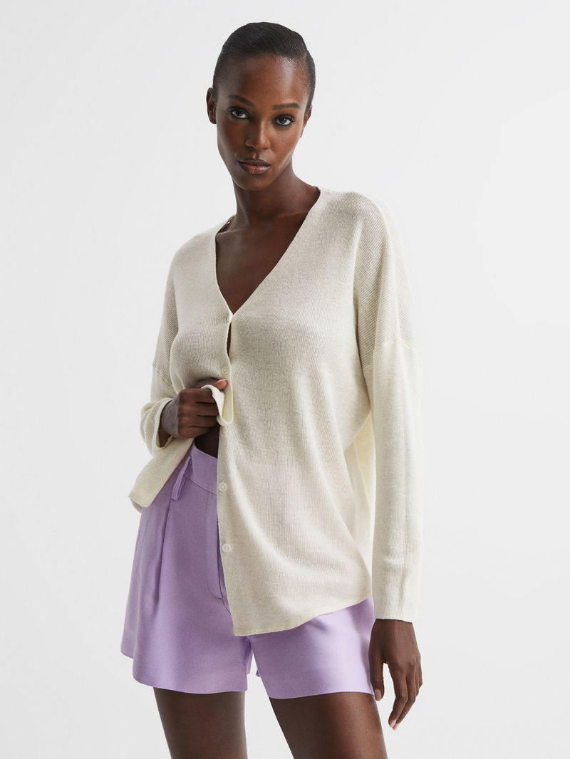 The Penny cardigan in cream is a luxe seasonal wardrobe addition, ideal for layering during cooler snaps or as a lightweight cover-up for warmer days. The dropped shoulder seams and curved hemline lend a relaxed outlook. Style with shorts for on-trend summer styling.