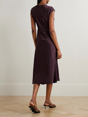 Inspired by our bestselling Fae and Micah styles, the Michelle dress blends signature elements into one refined design. Crafted from fluid satin, it features a tucked waist that drapes through an asymmetric midi hem, while a soft cowl neckline flows into a cape-style back for an elegant finish. Satin. Cape style. Waist tuck detail. Sleeveless. Concealed zip to reverse.Petite side neck to hem.
