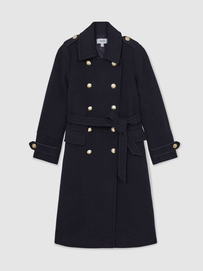 The double-breasted utility-inspired Farley coat is defined by polished gold-tone buttons embossed with crests. It’s crafted from a wool-blend and designed for traditional appeal, with its epaulettes, classic collar, flap pockets and a belt that cinches the waist.
