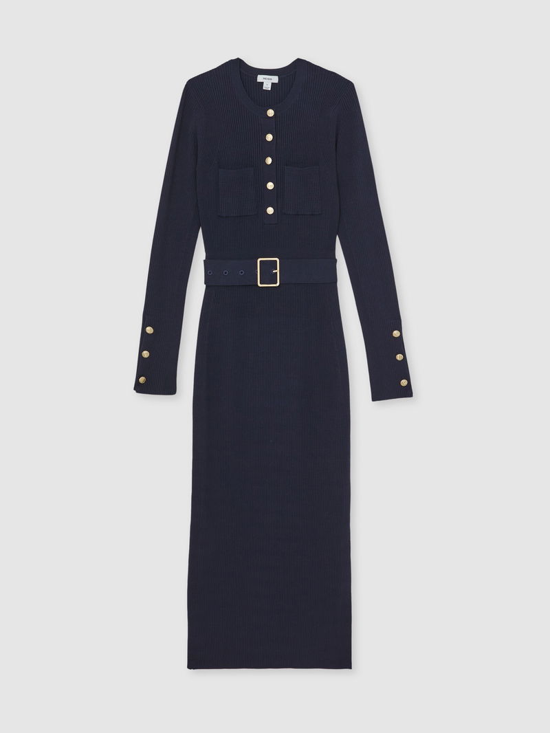 Rib-Knit Buttoned Belted Midi Dress In Navy
