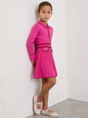 The Colette dress is crafted from a ribbed, pointelle knit for a textured finish. Contrasting stripes add a bold touch, whilst the polo collar with a button placket gives it a sporty vibe. The flared skirt completes the look with a playful finish.
