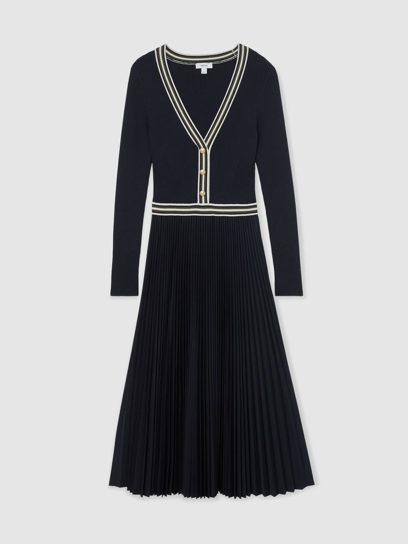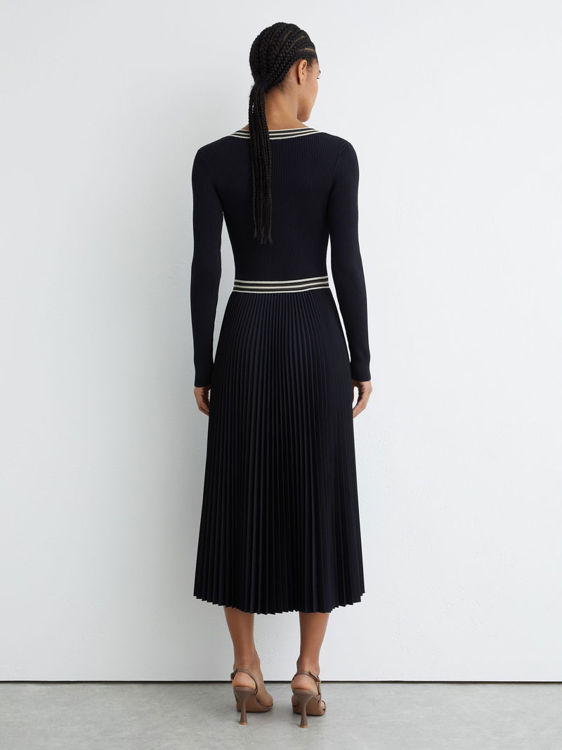 Rib-Knit Stripe-Trim Pleated Midi Dress In Navy