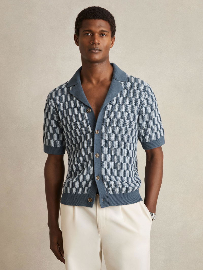 The Robbie shirt is knitted with chunky ribs in a checkerboard pattern, creating a bold, summer-inspired look. A Cuban collar enhances its relaxed aesthetic, while ribbed trims add a refined finish.
