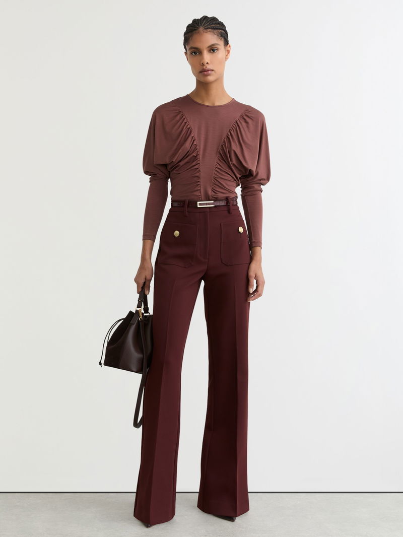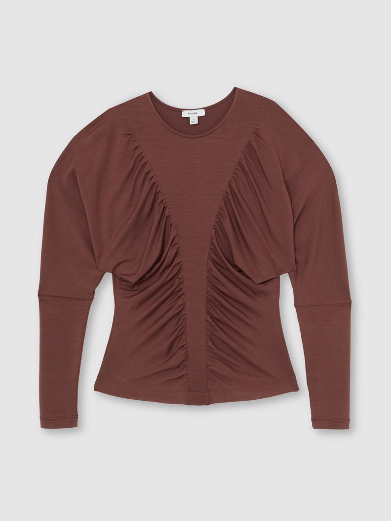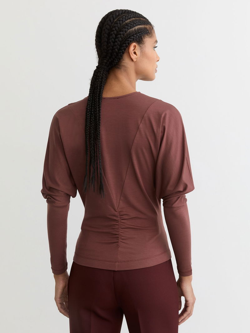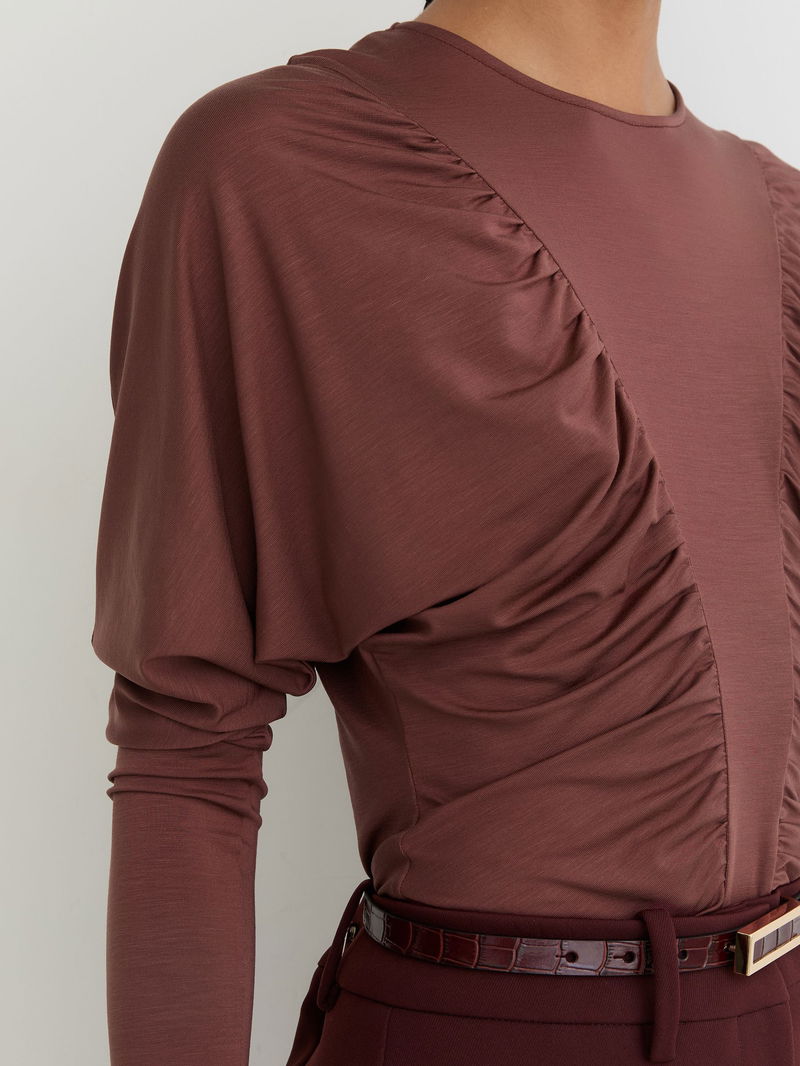 The Fenna top is crafted from stretch lyocell jersey for a soft, fluid drape. It features ruched detailing through the front and long Juliet-style sleeves.
