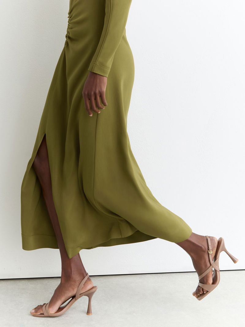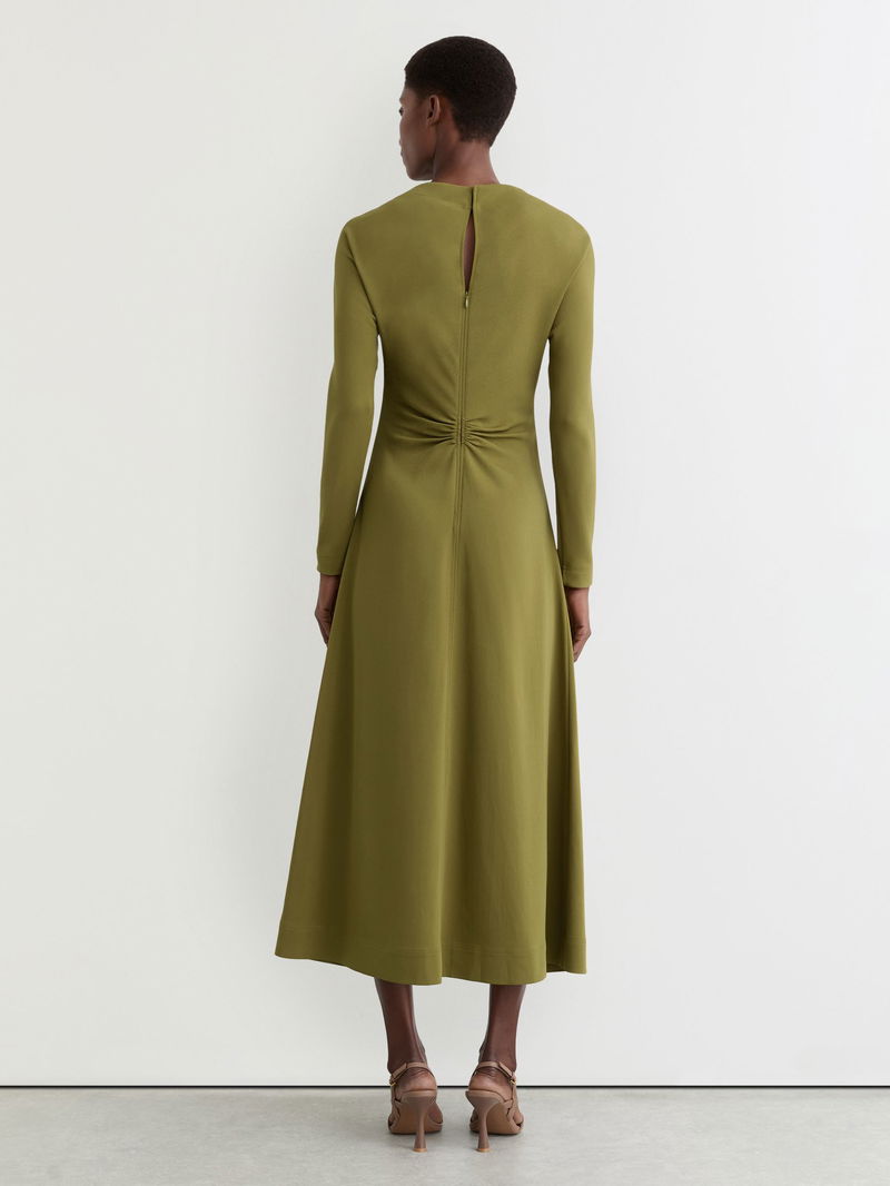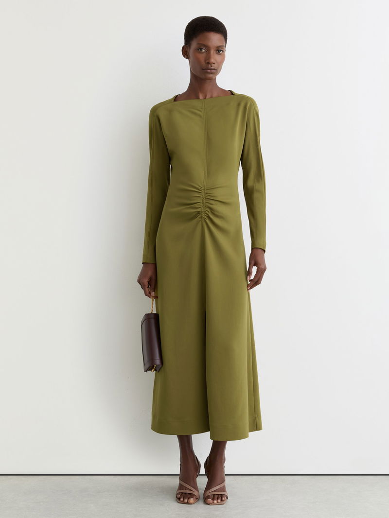 Ruched Long-Sleeve Midi Dress In Chartreuse Green