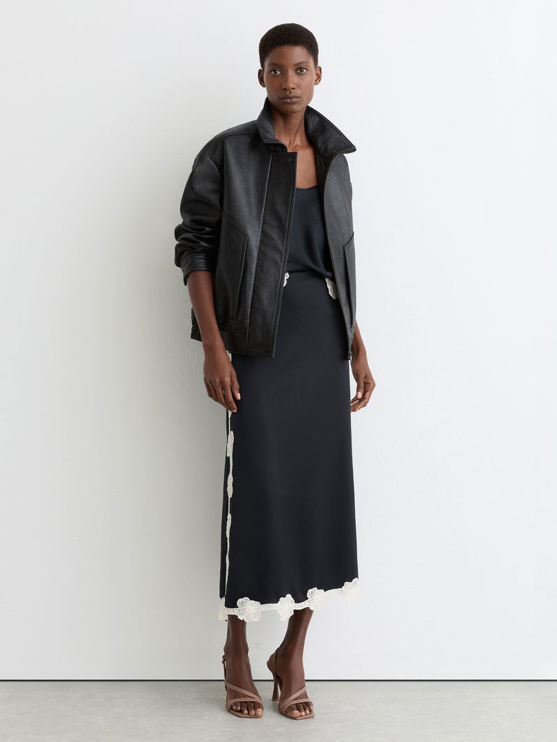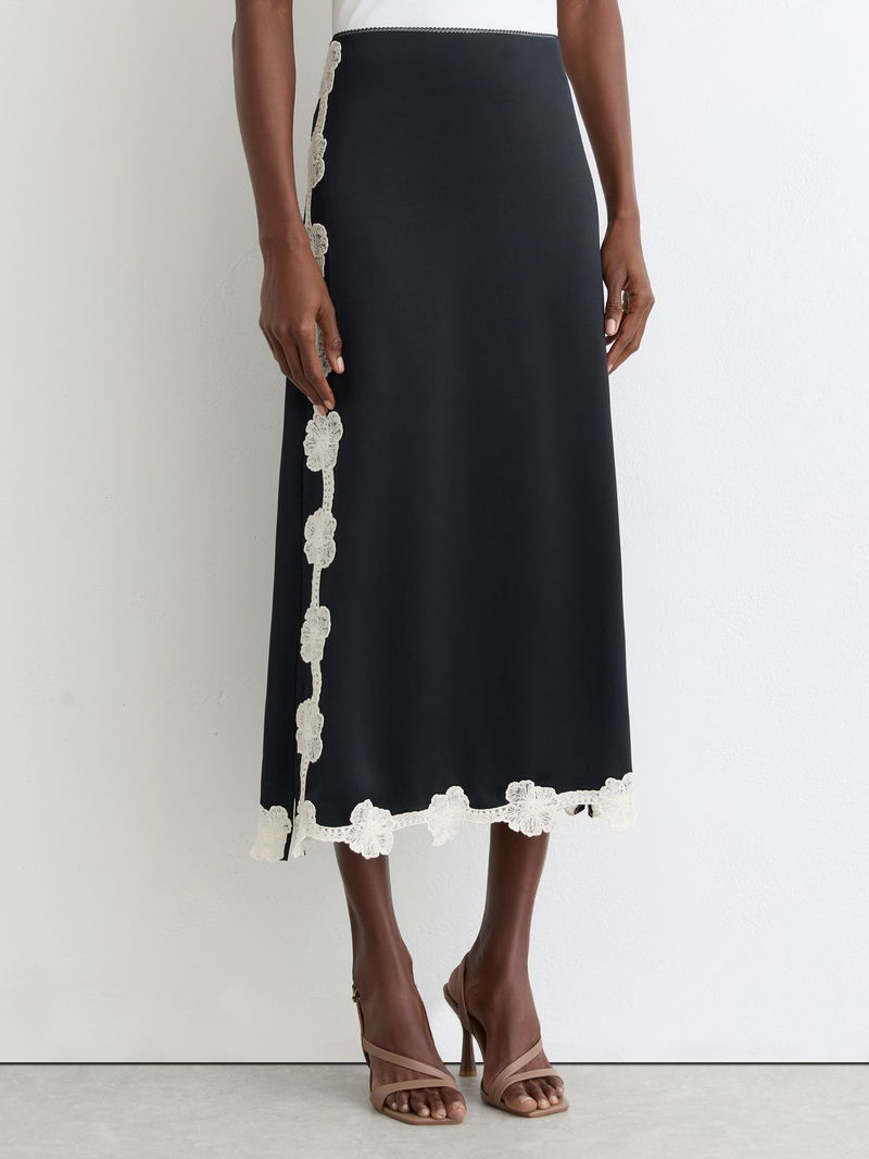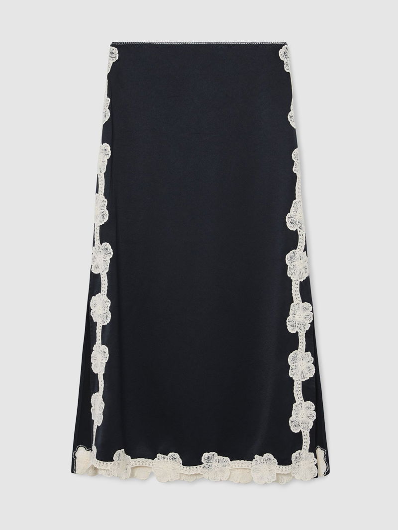 Satin Floral-Lace Trim Midi Skirt In Navy