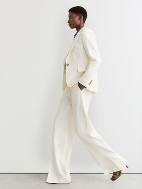 The Navy Sidney trousers combine classic nautical influences with modern design, showcasing a buttoned front flap and a gold-tone zip detail at the waist. Crafted with stretch for comfort, the wide-leg silhouette is fastened by a concealed side zip.