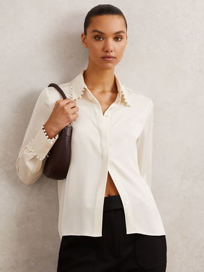 Crafted from 100% silk satin, the Ameira shirt drapes fluidly with a near-liquid lustre. Its concealed button placket maintains a sleek profile, while double-buttoned cuffs add a tailored finish.