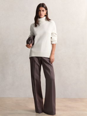 The ecru Sofie jumper is knitted to a structured A-line silhouette with a high neckline and long sleeves. Wear it with slim-leg tailoring in a fresh grey or blue hue for a look that takes you from work to the weekend.