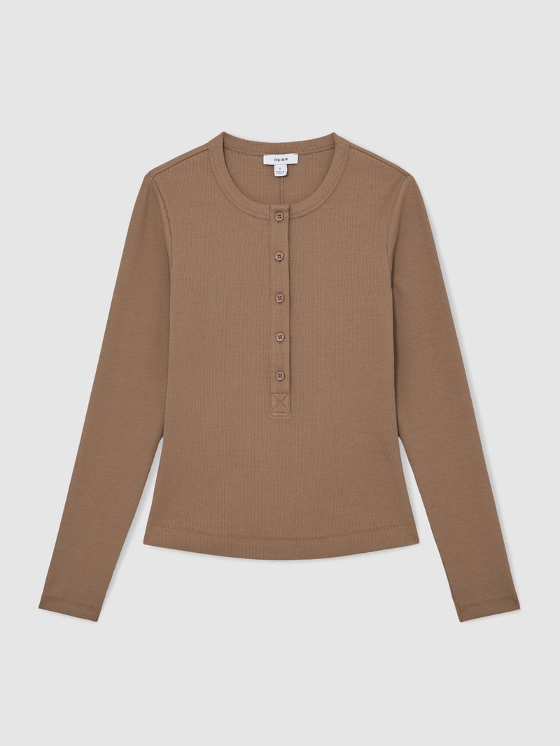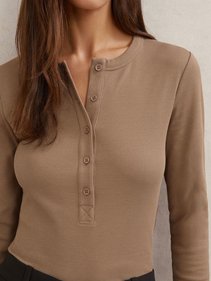 Stretch-Cotton Half-Button Top In Taupe Brown