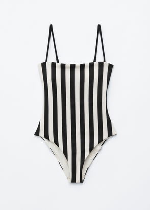 The Lenny plunge-neck swimsuit has a contemporary striped design and a checked fastening to the neckline. The open-back fastens with a tie.