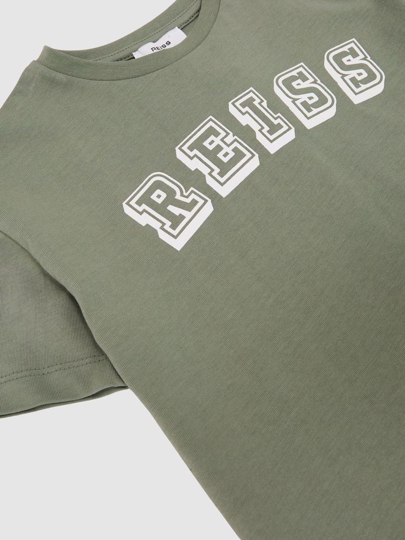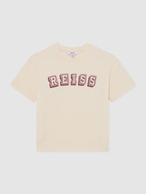 The Leonard T-shirt is crafted from 100% cotton in an oversized fit, featuring a varsity-style Reiss logo print at the front. It has a crew neckline and short sleeves.