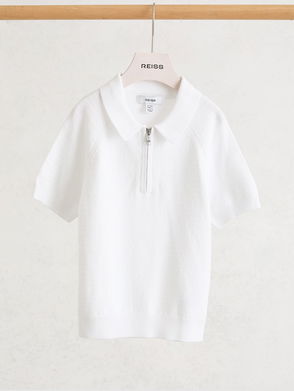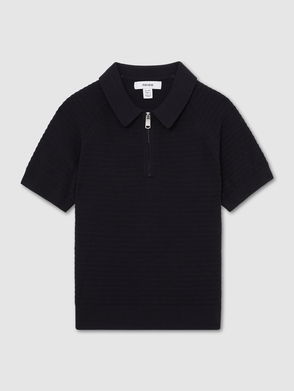 A textured knit with a slight sheen defines the Atticus polo shirt, creating a tactile geometric pattern. A half-zip fastening adds a modern edge, while a polo collar and rib-knit trims complete the design. Textured knit. Polo collar. Rib-knit hem and cuffs. Half-zip.