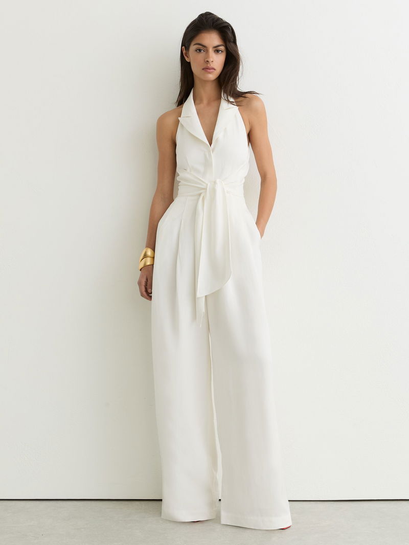 Tie-Front Wide-Leg Jumpsuit With Linen In Ivory Cream