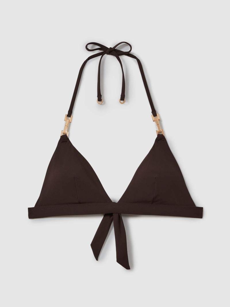 The Riah bikini top is shaped with classic triangle cups that tie at the neck and back. Gold-tone hardware and removable padding add a refined finish.