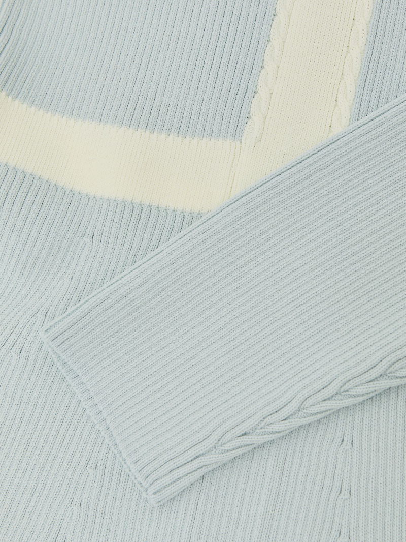 Contrasting bands define the silhouette, framed by braided cable stitching for a crafted, tactile finish. A V-neckline and long sleeves complete the look.