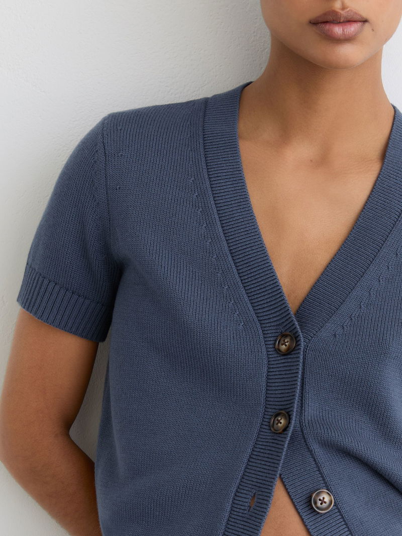 V-Neck Short-Sleeve Cardigan Cotton-Wool In Blue