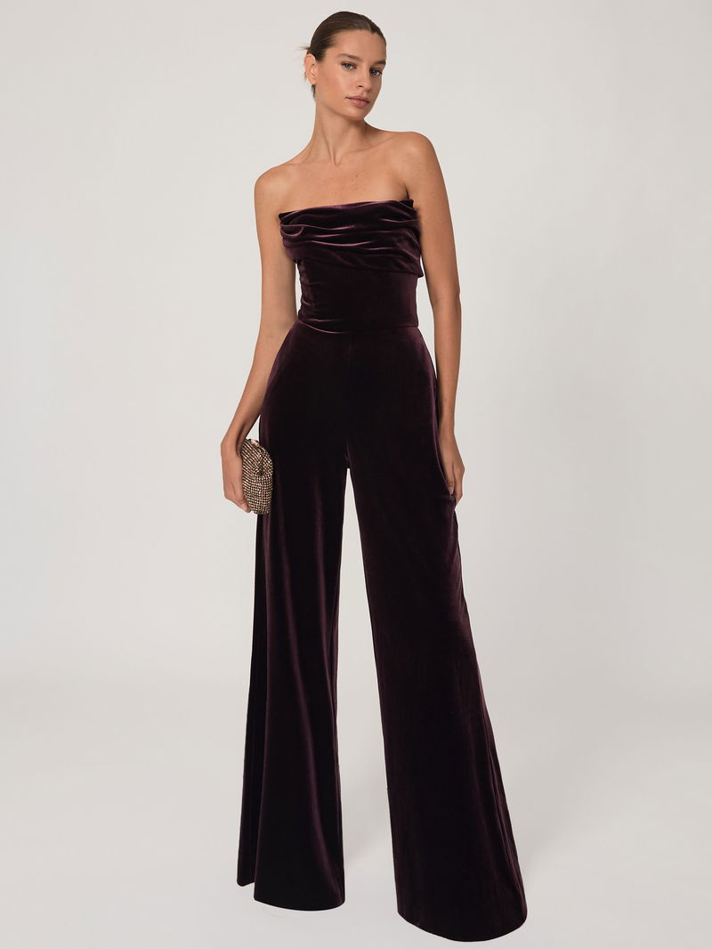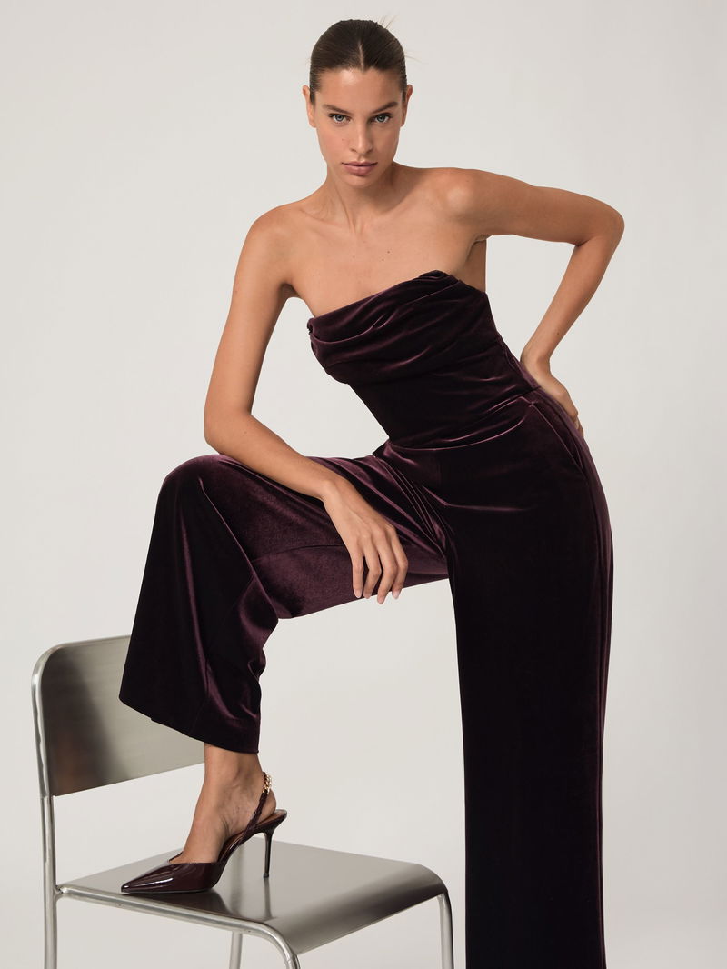 Velvet Drape Strapless Jumpsuit In Burgundy