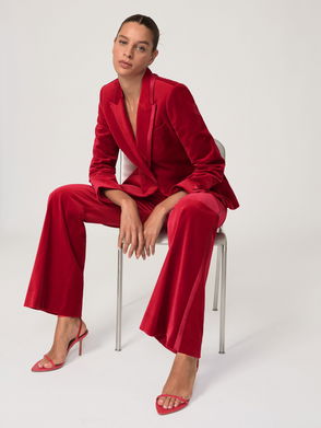 The Verda trousers are crafted from plush velvet for an elegant eveningwear feel. Flared legs are accented with satin tuxedo stripes, creating a sleek silhouette with subtle statement detail.