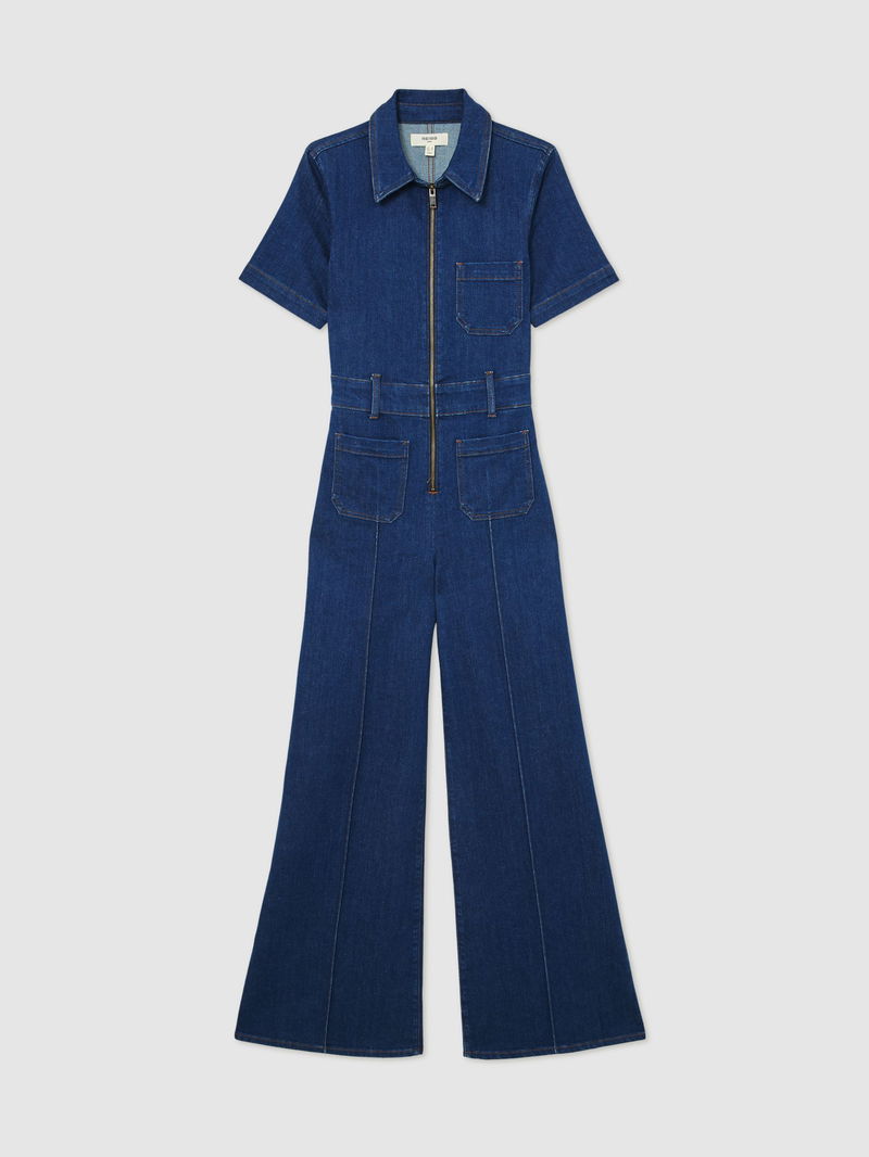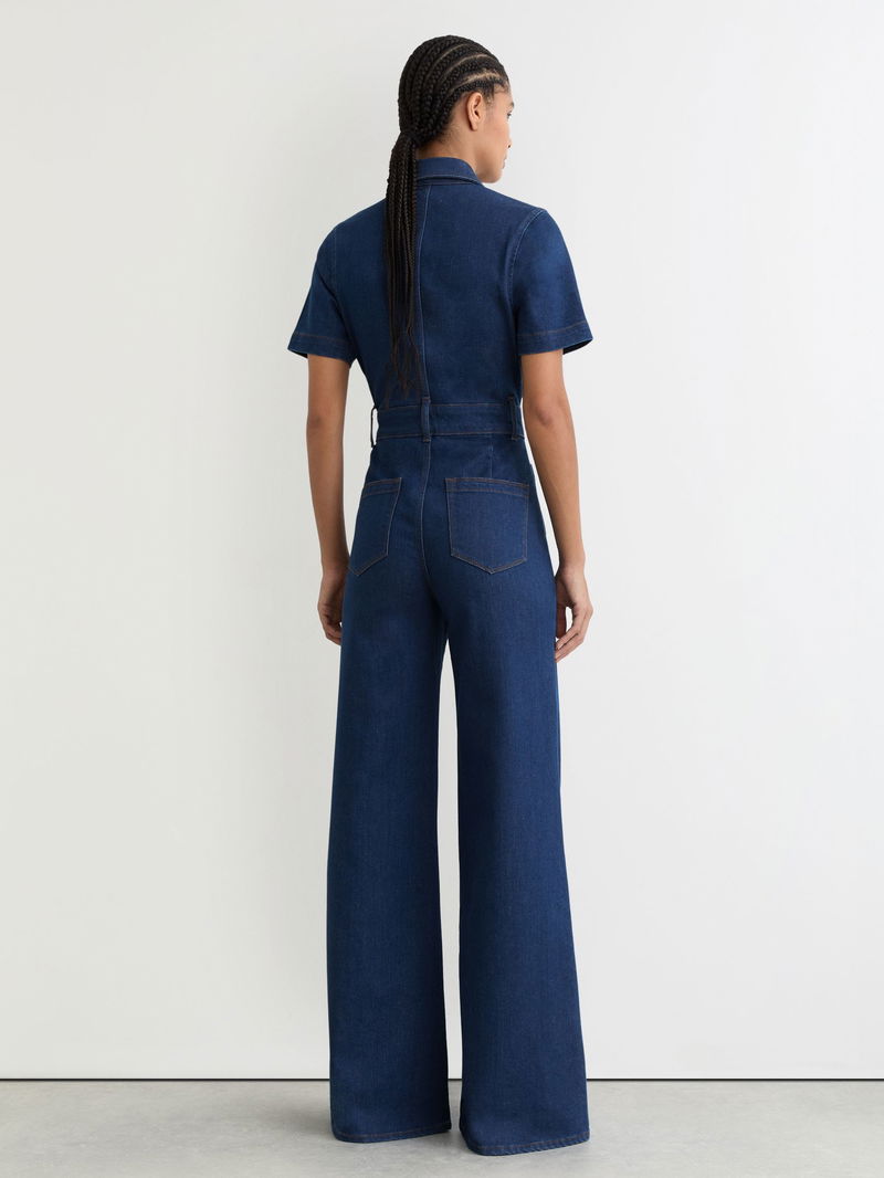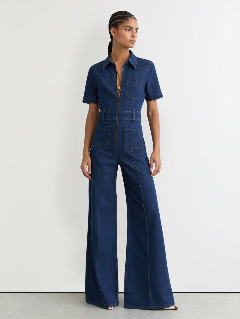 Wide-Leg Zip-Through Denim Jumpsuit In Indigo Blue