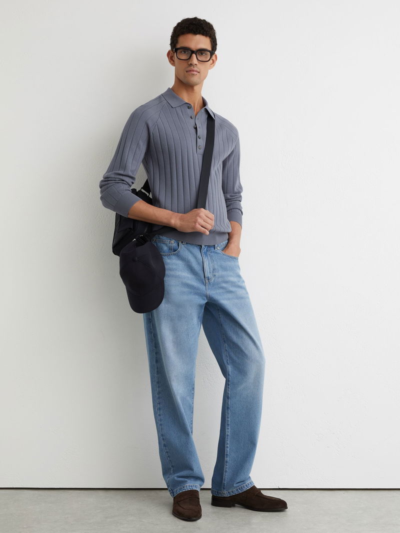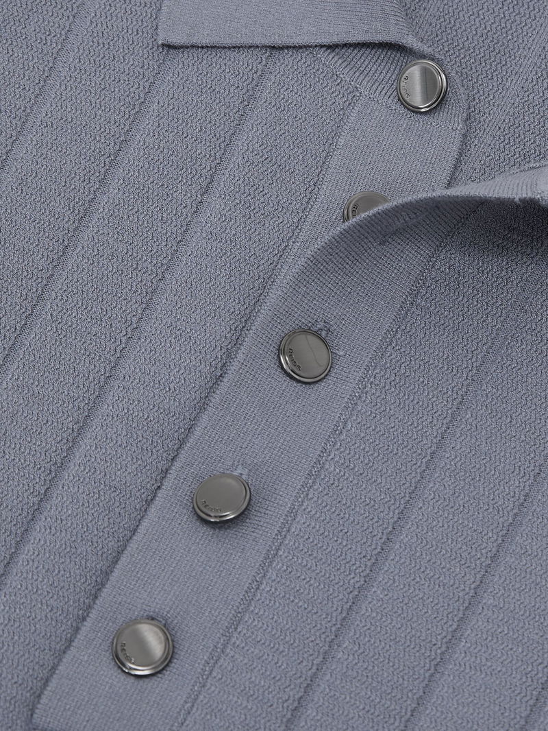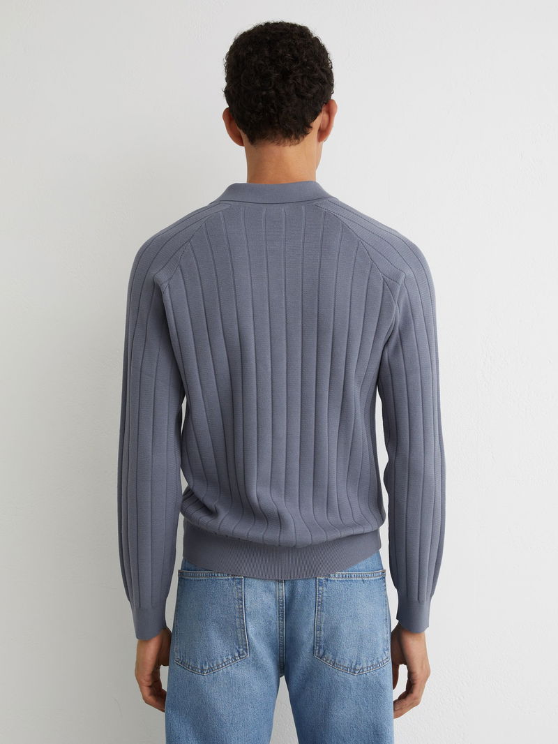 Wide-Ribbed Half-Button Polo Jumper In Steel Blue