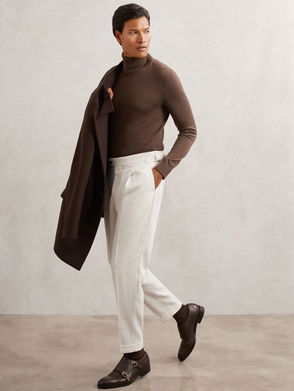 Elegant front pleats and slide-buckle belt offer a polished finish. Wool blend. Twill weave. Regular fit. Belt with slide buckle. Front pleats.