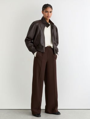 The Aubergine Solene trousers offer an effortlessly modern take on classic tailoring, cut from a wool-blend twill fabric to a fluid, wide-leg silhouette. Pressed creases and pick-stitched side pockets enhance their polished appeal.