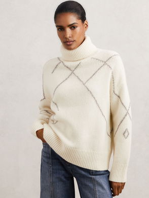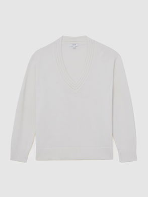 Inspired by classic cricket styles, the ivory Nina jumper is crafted from fine wool with an exquisitely soft hand-feel. A flat open collar is complemented by a subtly embroidered V-Neckline.