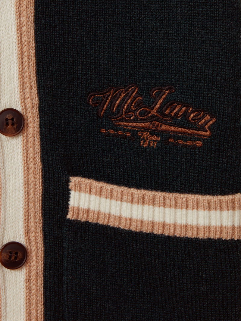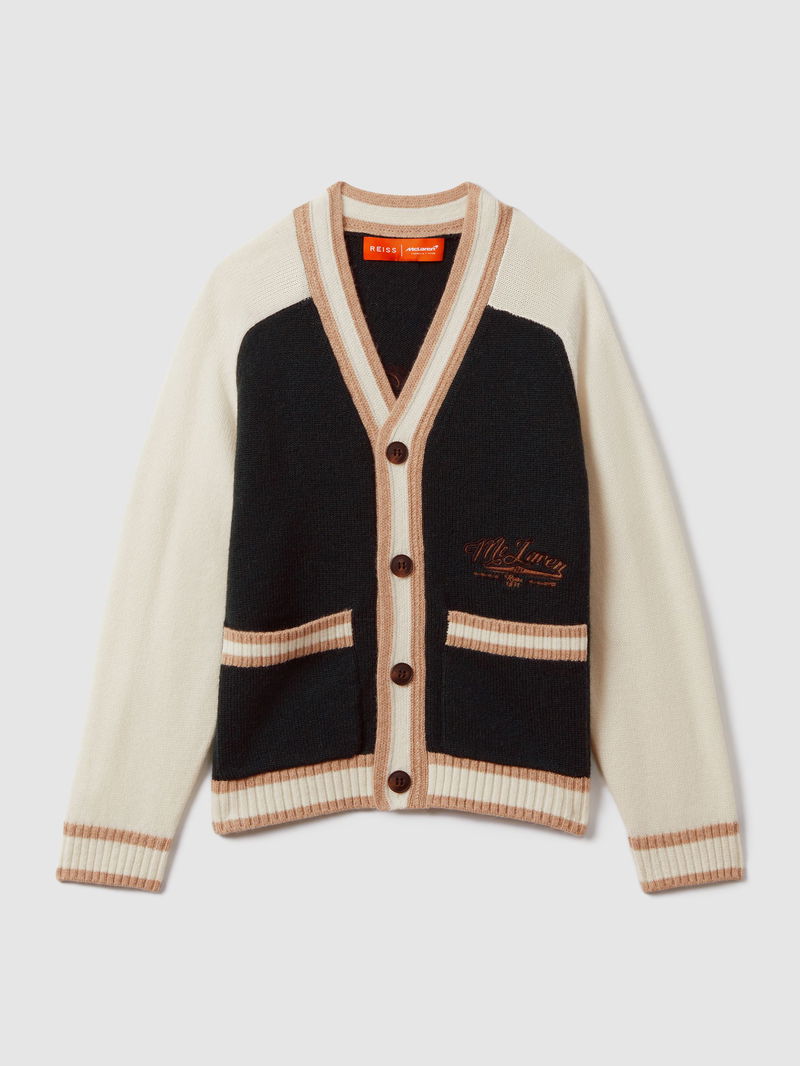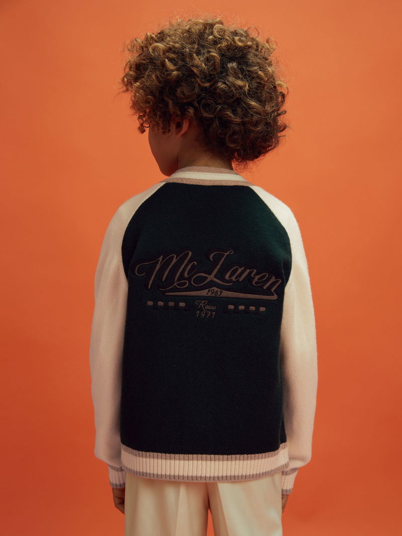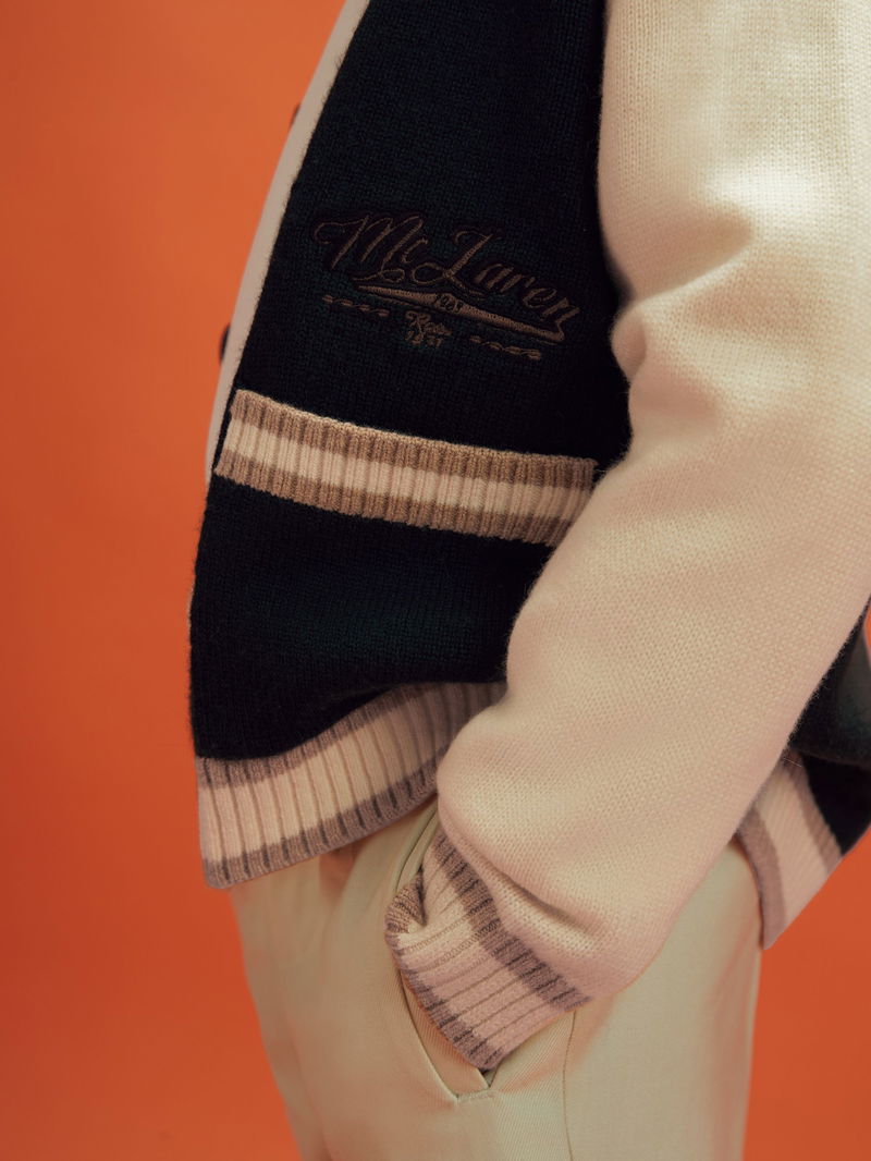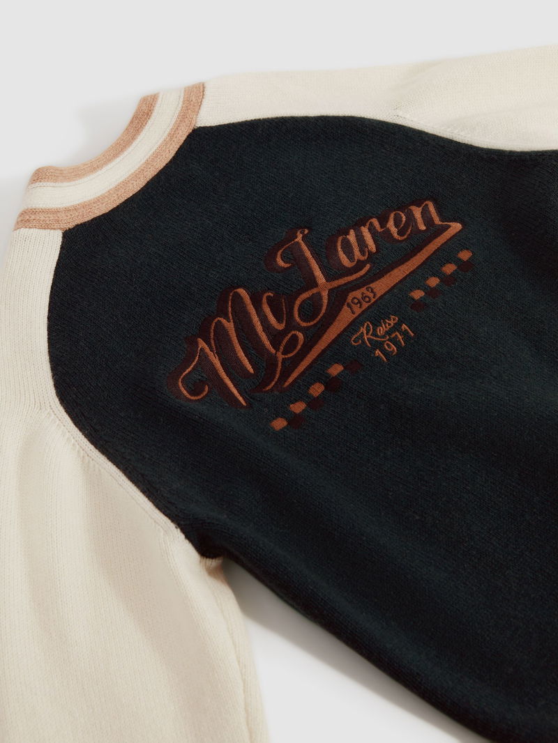 The Tenbury cardigan is spun from a premium blend of wool and cashmere with ribbed trims and raglan sleeves. Embroidered McLaren F1 branding features on the front and reverse.