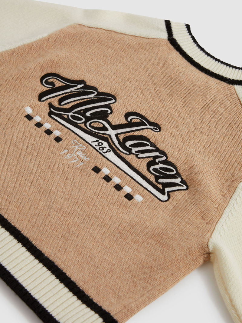 The Clio jumper is spun from premium wool and cashmere into a colourblock design with raglan sleeves and ribbed trims. Slightly cropped, this style is finished with embroidered McLaren F1 branding on the chest and back.