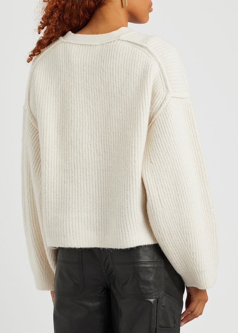 Remain by Birger Christensen knitted cardigan V-neck, ribbed, dropped shoulders, reverse seam details. Button fastenings through front.