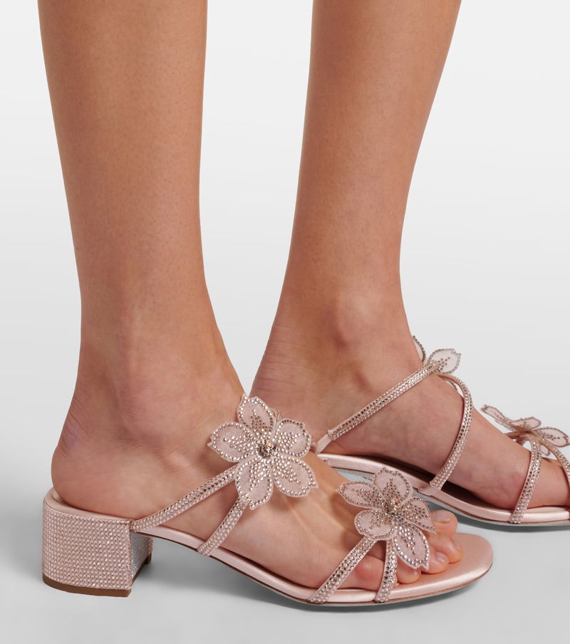 Step into glamour with the Floriane sandals from Rene Caovilla. Crafted with pink-hued satin uppers, the block-heeled pair is adorned with elegant floral-appliqués.