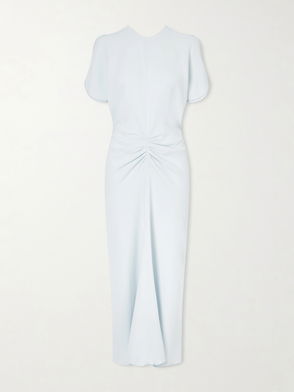 RHODE’s azure-blue Mai midi dress taps into the label’s romantic bohemian verve. It’s crafted from folds of lustrous crepe with a pleated high neck that ties into a bow across the open back, with voluminous balloon sleeves and a calf-length hemline. Style it with a shoulder bag and heeled mules for a ladylike evening look.