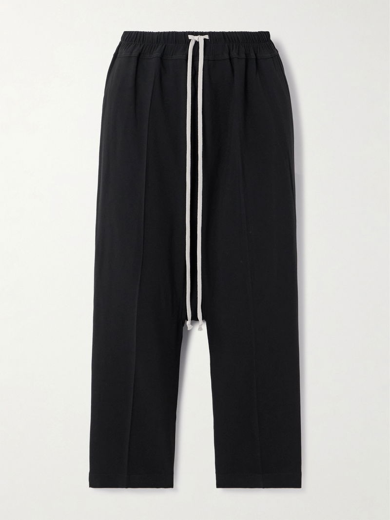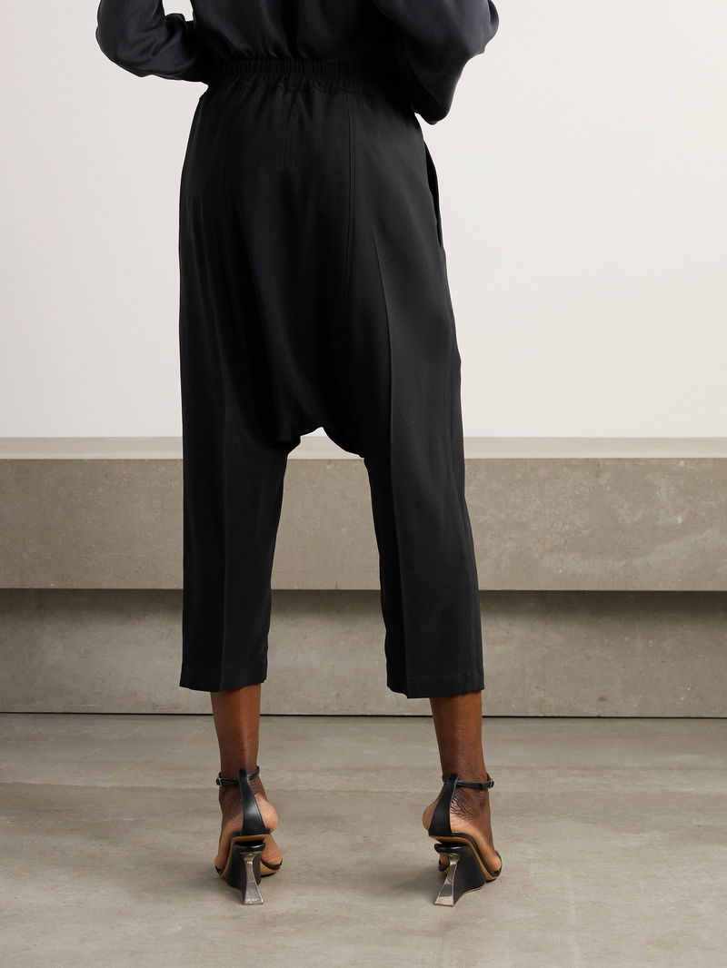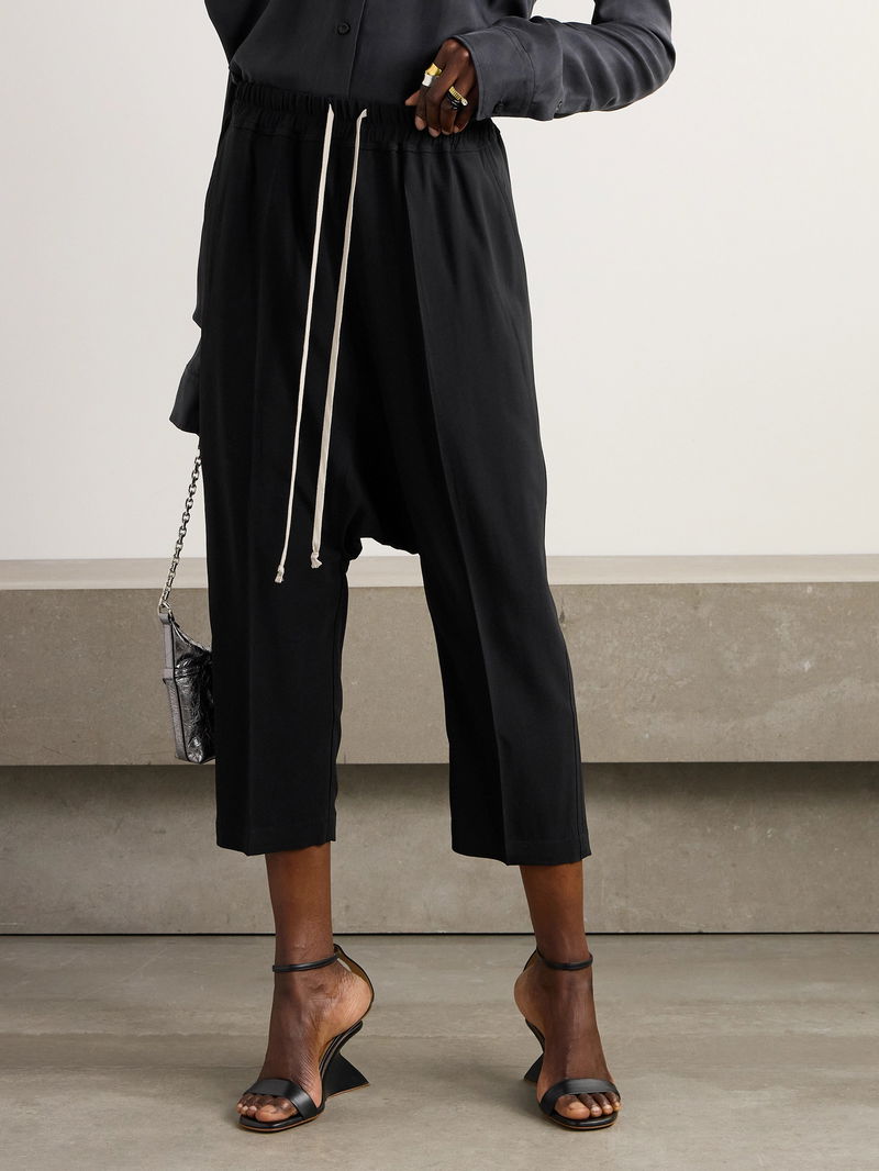 Rick Owens gives its signature track pants a polished twist. This pair is cut from crepe with cropped, straight legs and topped with extra-long ties at the waistband.