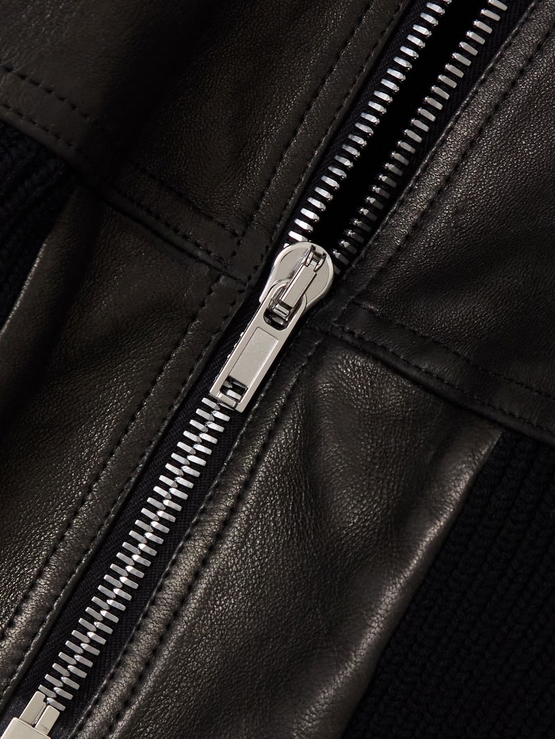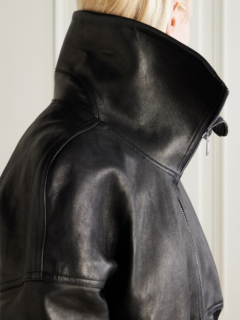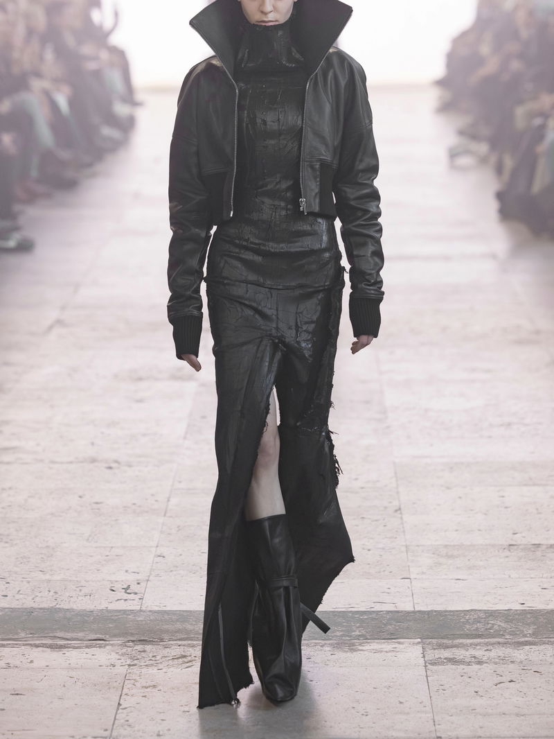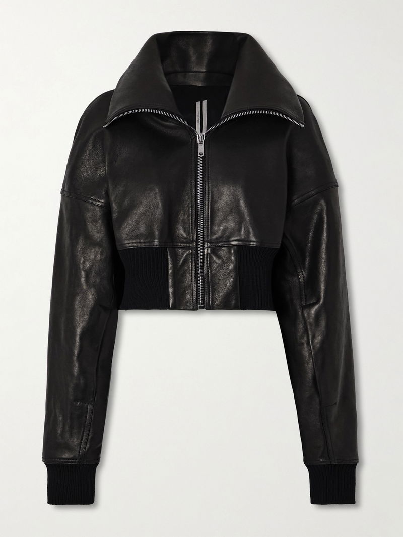 Rick Owens refers to the exaggerated funnel neck of this jacket as a ‘Dracucollar’—a dramatic detail that defined the Fall ’25 runway. Crafted from supple leather, it’s finished with ribbed trims that accentuate the cropped silhouette.