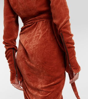Rick Owens’ black dress is ribbed-knit from virgin wool with a folded one-shoulder neckline and falls to a maxi hemline with front and back slits.