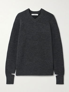 Rick Owens alters the silhouette of this brown Rasato virgin-wool sweater by adding cutaway accents at the shoulders and cuffs, creating ultra-long draping sleeves.