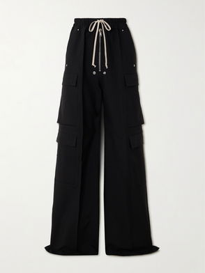 Rick Owens' satin cargo pants have a lustrous finish and fluid drape, so they feel like a more elevated take on utilitarian styles. They have dramatic drawstring waist ties and fall to pooling wide legs.