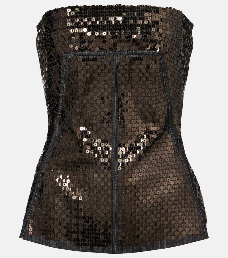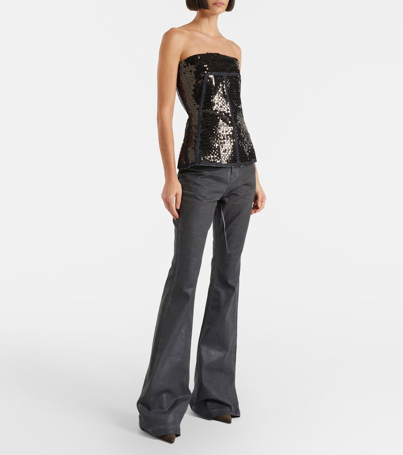 Aptly nicknamed The Lord of Darkness, Rick Owens brings gothic and industrial inspiration to avant-garde design. This bustier top is made from denim in a sequined silhouette.