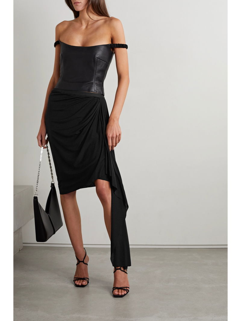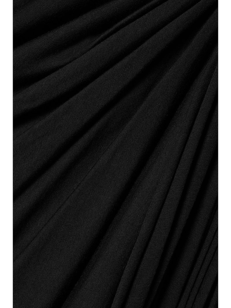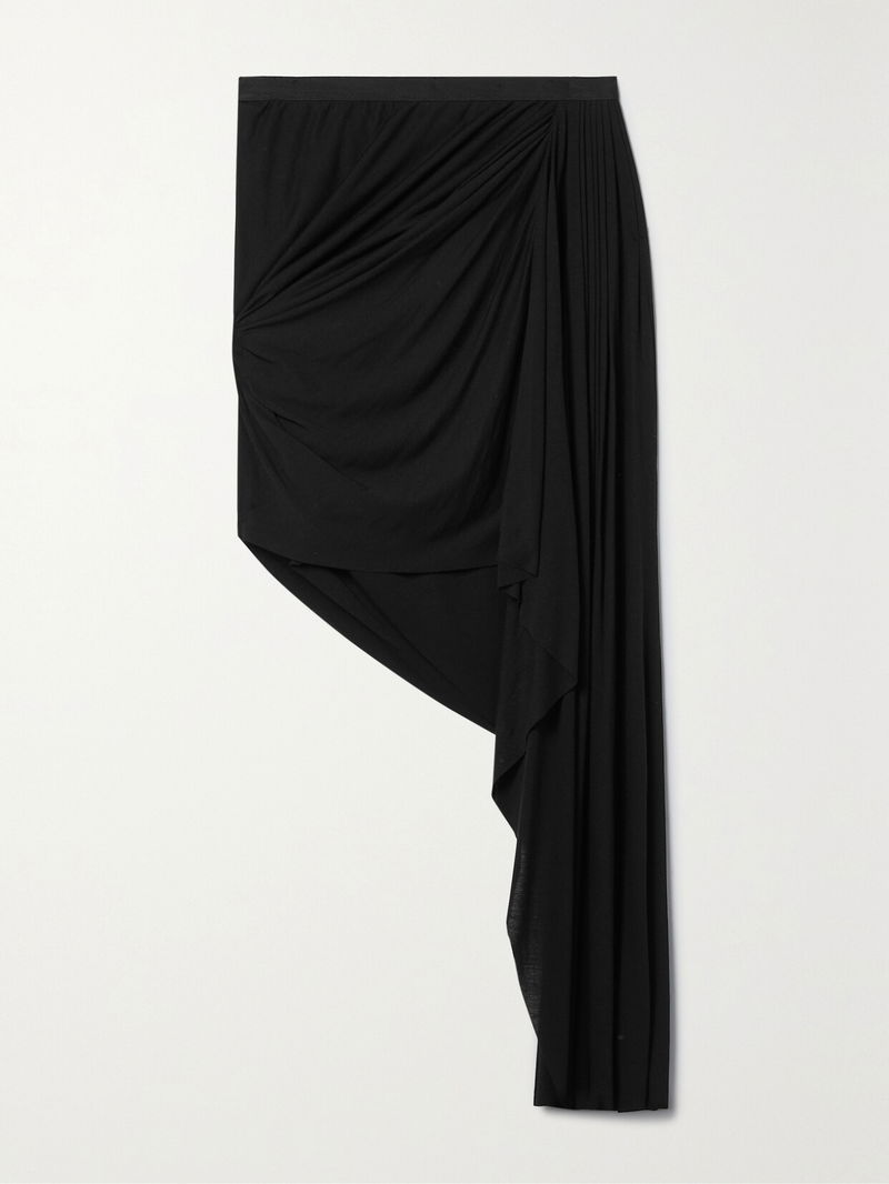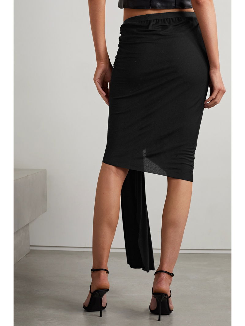 Rick Owens' 'Stevie' skirt has an asymmetric hemline and figure-hugging silhouette. Cut from black jersey, it's beautifully gathered along one side and has a sweeping panel that drapes to the ankle.