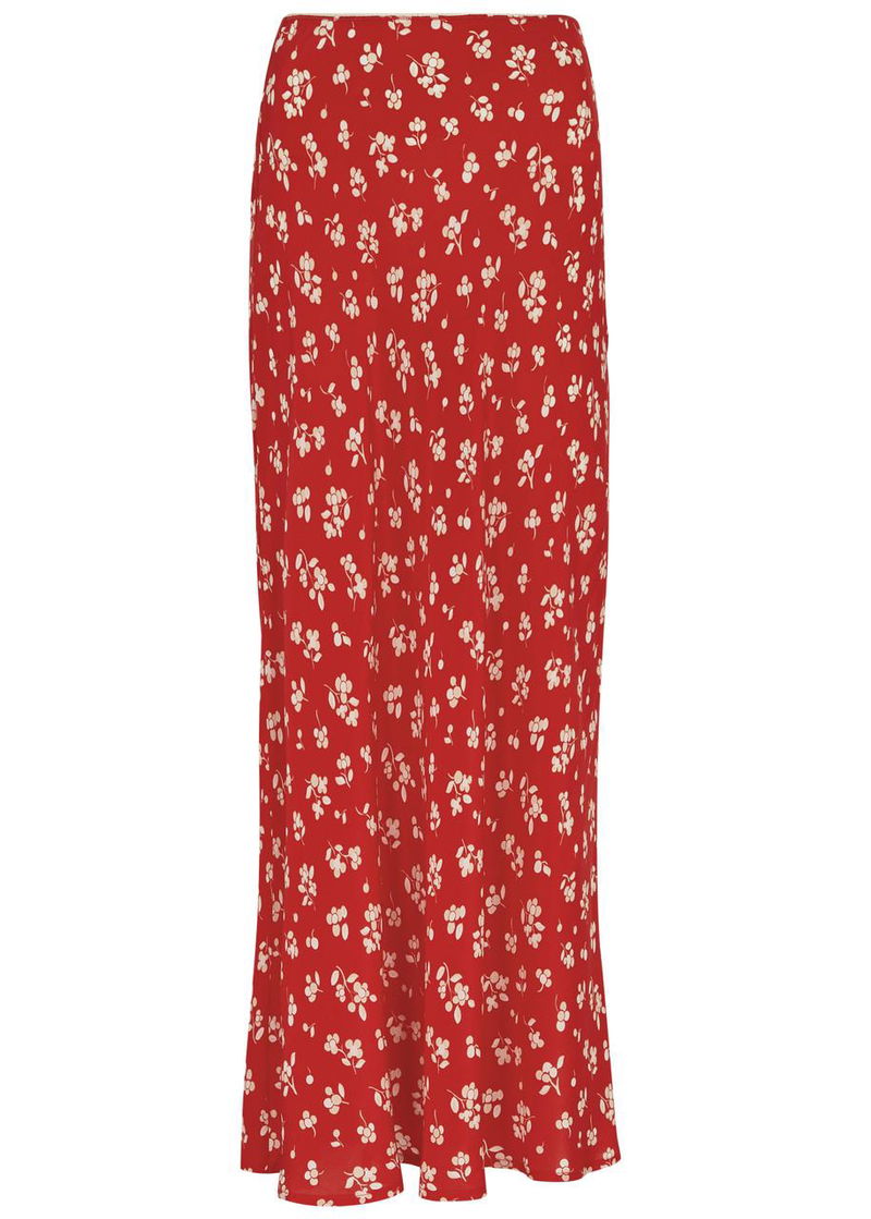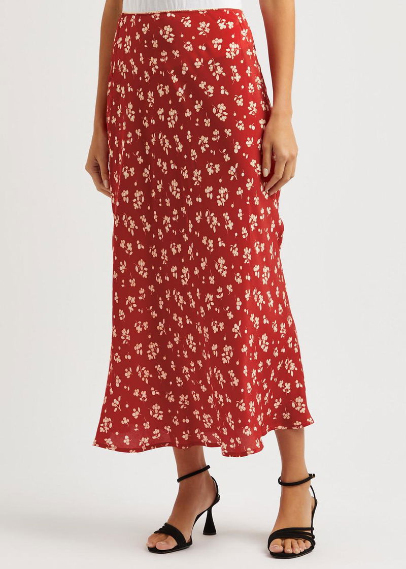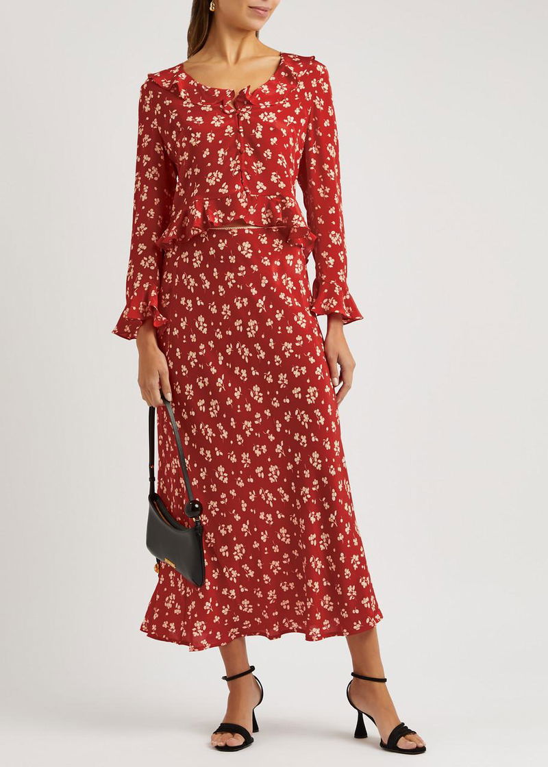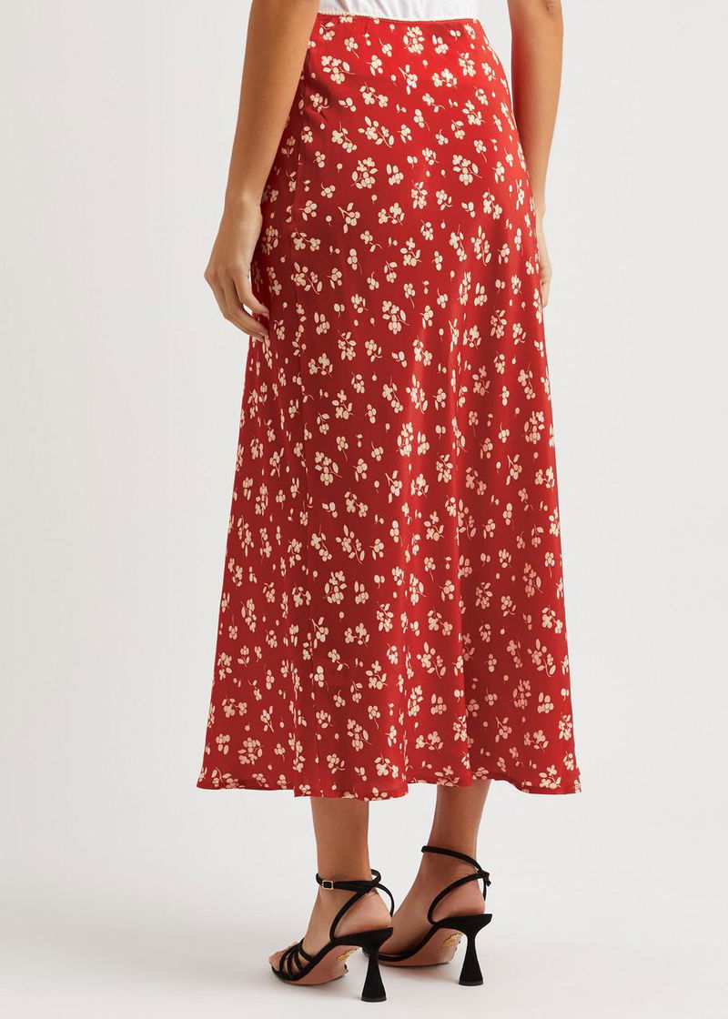 Rixo silk skirt. Floral print, elasticated waist, picot trims.