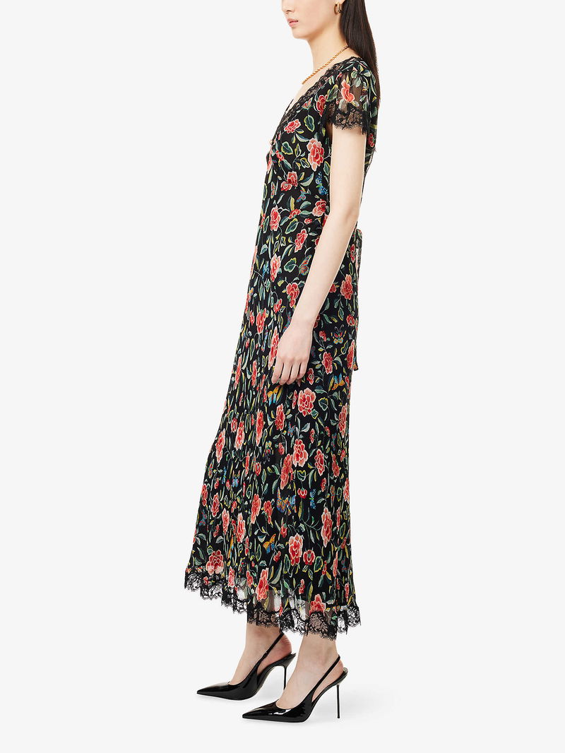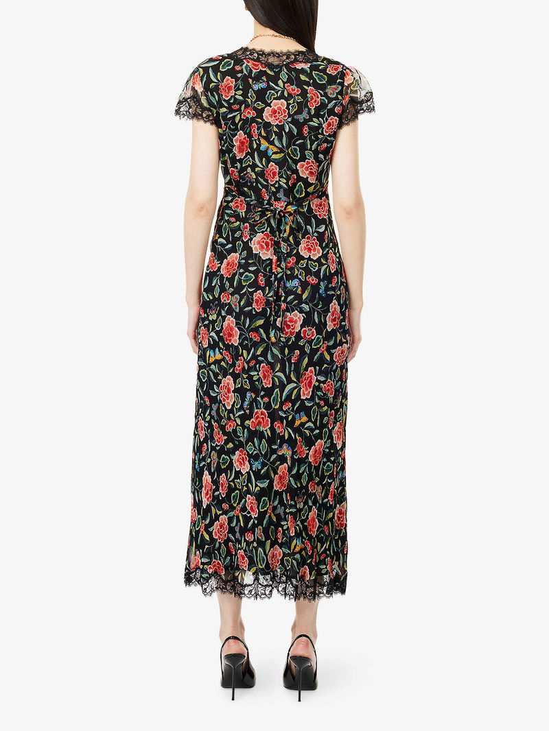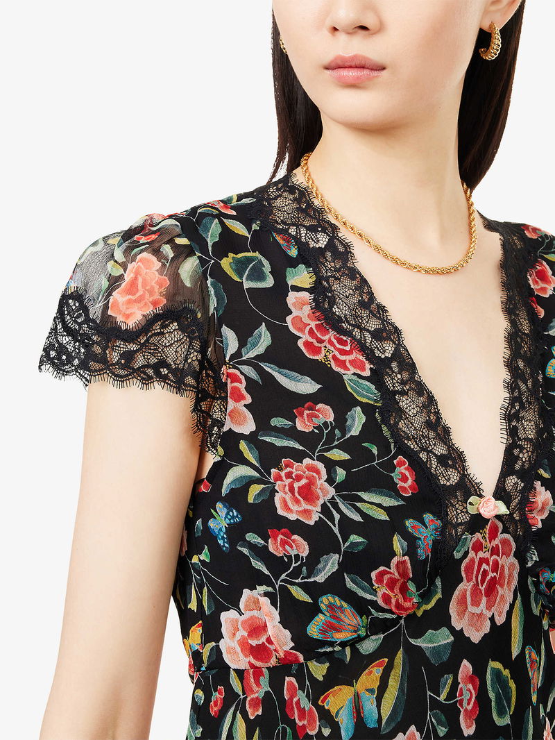 • Regular fit, V-neck, cap sleeves, satin rose appliqué at front, self-tie fastening belt, all-over floral and butterfly print, all-over crepe texture, lace embroidery trims, fully lined